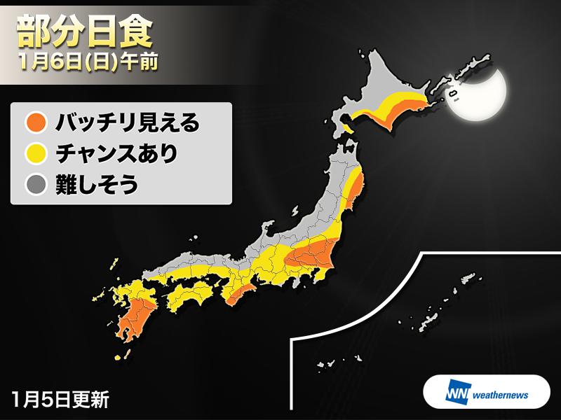 6日(日)は冬型の気圧配置となるため、太平洋側のエリアでは広い範囲で日食を楽しむことができそうです。
