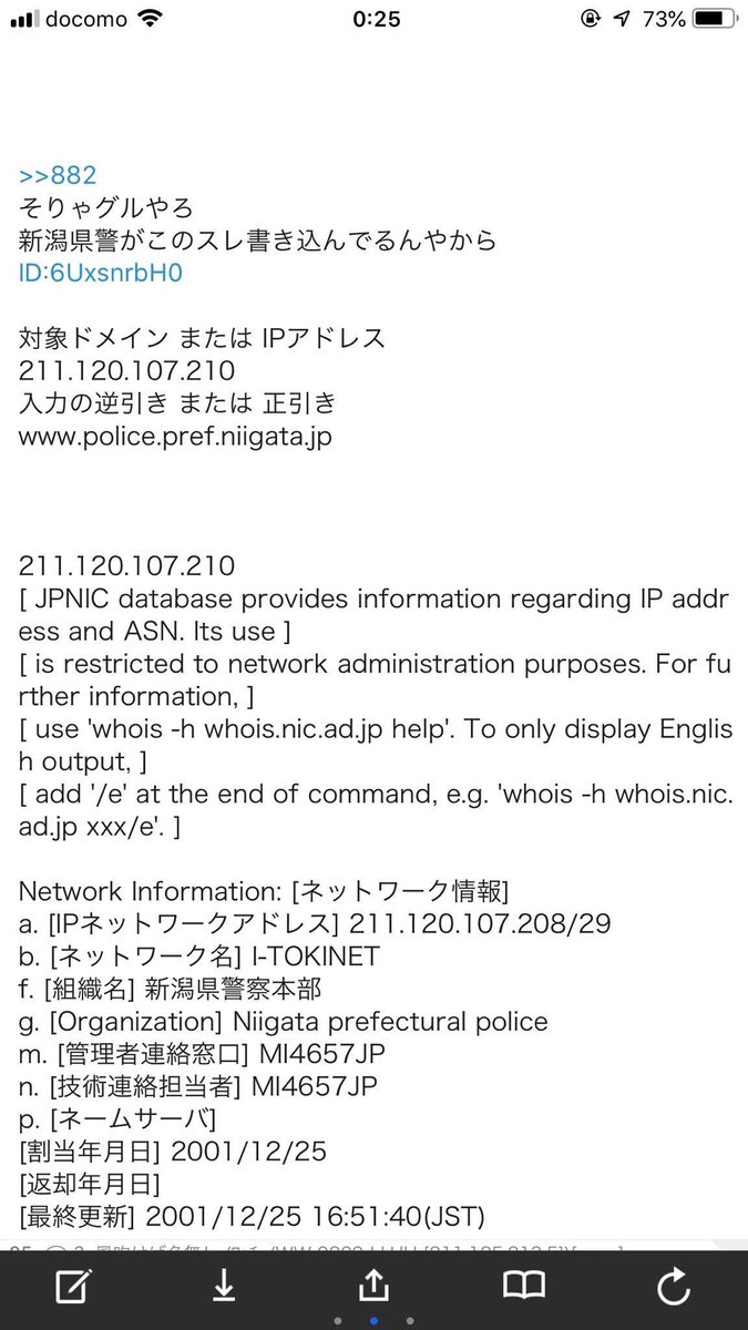「うんちぶりゅりゅ!」と書き込んだ投稿者は、IPアドレスやホストを表示する「fusiananan」を使いIPアドレスを表示しており、このIPアドレスを調べると組織名「新潟県警察本部」、ネットワーク名「TOKINET」、ホスト名「www.police.pref.niigata.jp」と表示されます。