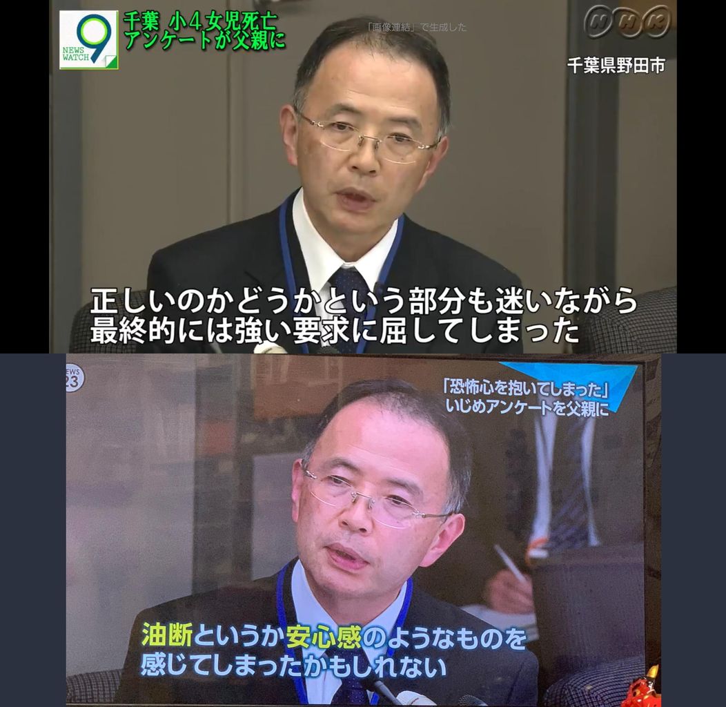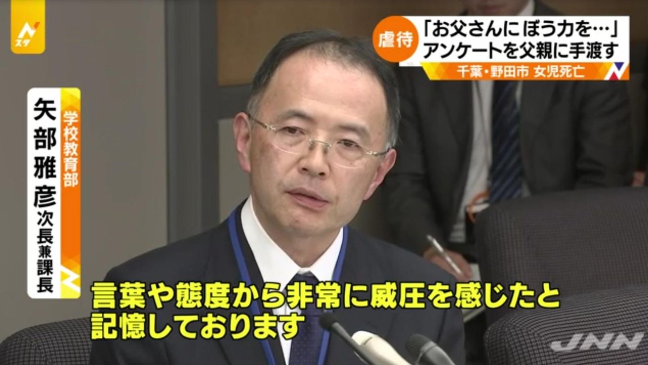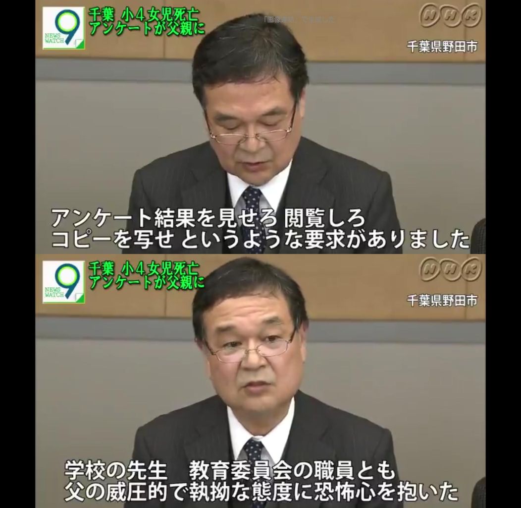 千葉県野田市の小4女児が自宅で死亡した事件で、女児が学校アンケートに「父からいじめ」とした回答を、市教委が父に渡していた。担当者は「威圧的な態度に恐怖を感じ渡した」と説明。