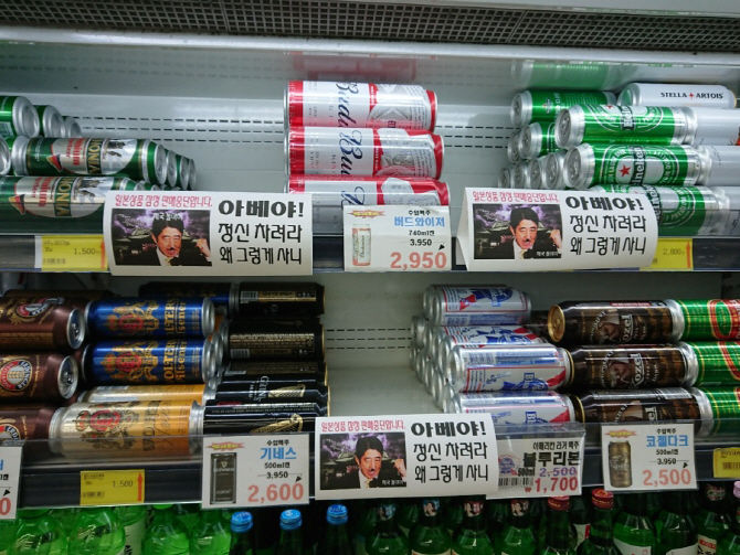 韓国のスーパーマーケット・・・安倍首相の顔をヒトラー風にし