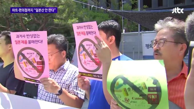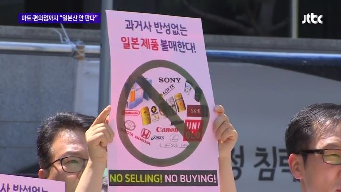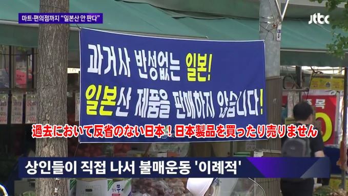日本がフッ化水素の輸出規制をしたことにより韓国がそれに反発して日本製品の不買運動を行い、韓国内のスーパーやコンビニで日本製品を撤去する運動が始まっている。