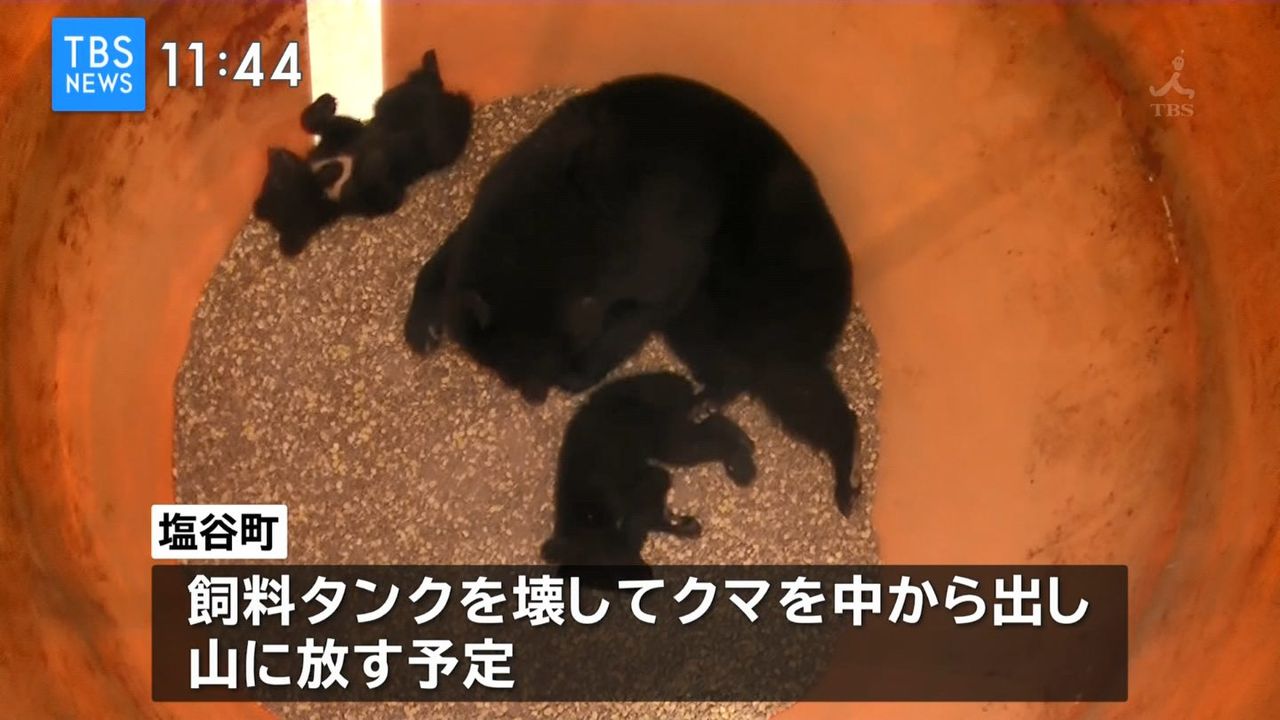 クマは体長1メートル超の1頭と40センチほどの2頭。タンクは高さ約6メートルで、内部にはトウモロコシなどの混合飼料が貯蔵されている。餌を求めたクマがタンク外側のパイプやはしごをつたって上り、上部のふた(直径約50センチ)を開けて内部に落ちたとみられる。