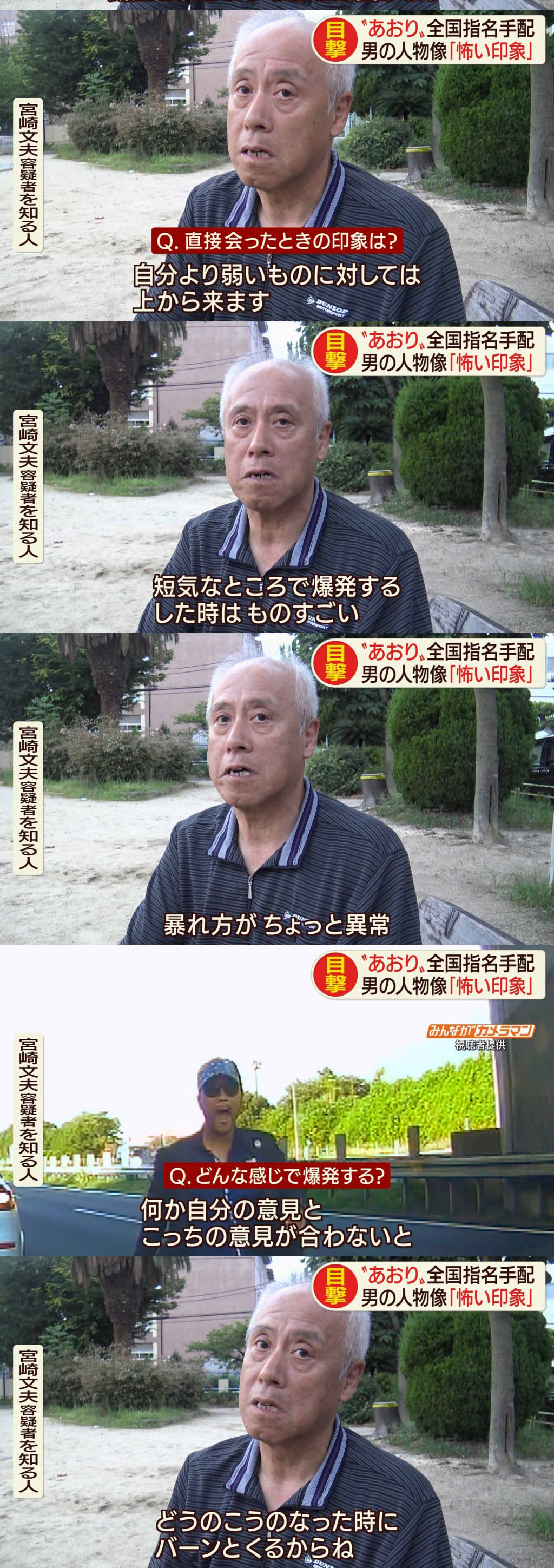 連行されるとき、宮崎はワーワーとずっと騒いでいて、なかなか警察車両に乗ろうとせず、さらに応援で警察官が何人かやってきて、なんとか後部座席に乗せるような有り様だった。