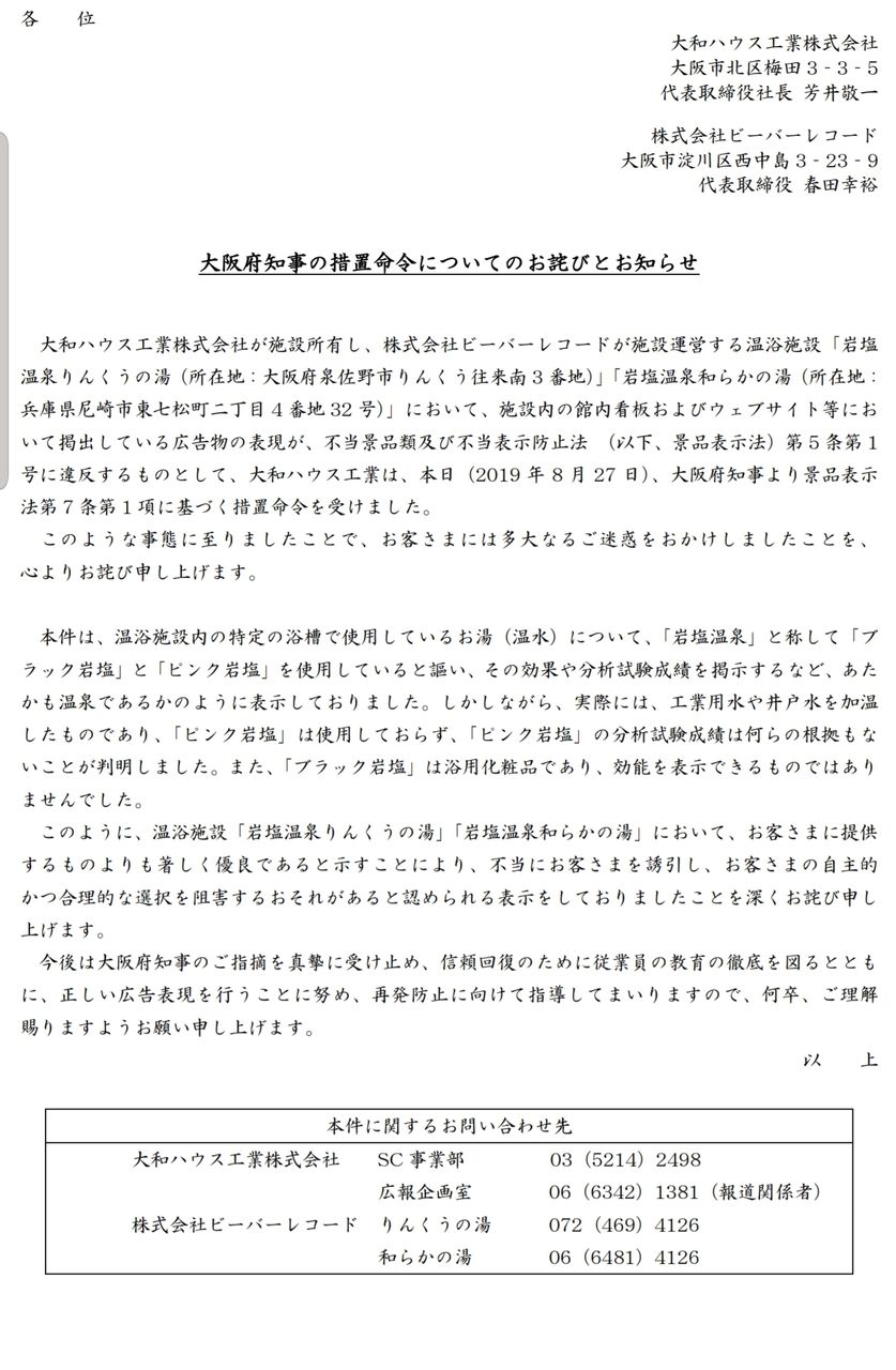 景品表示法違反で措置命令を受けたのは、泉佐野市の「岩塩温泉りんくうの湯」を所有する「大和ハウス工業」です。