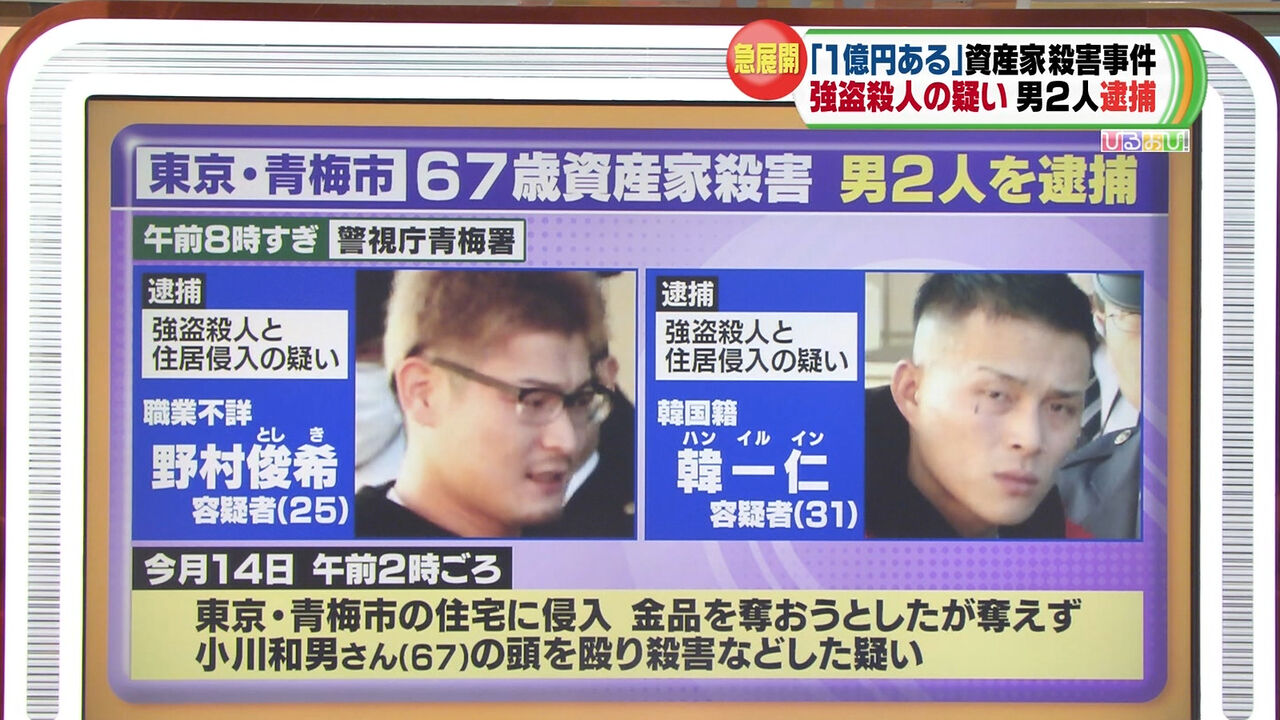 韓国籍の韓一仁(ハン・イルイン)容疑者(31)と、野村俊希容疑者(25)は12月14日の未明、青梅市成木の住宅に侵入し、小川和男さん(67)の頭を鈍器で殴り、殺害した疑いが持たれている。