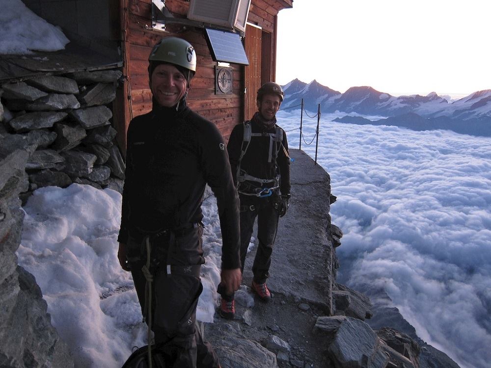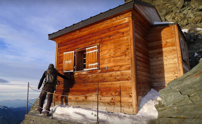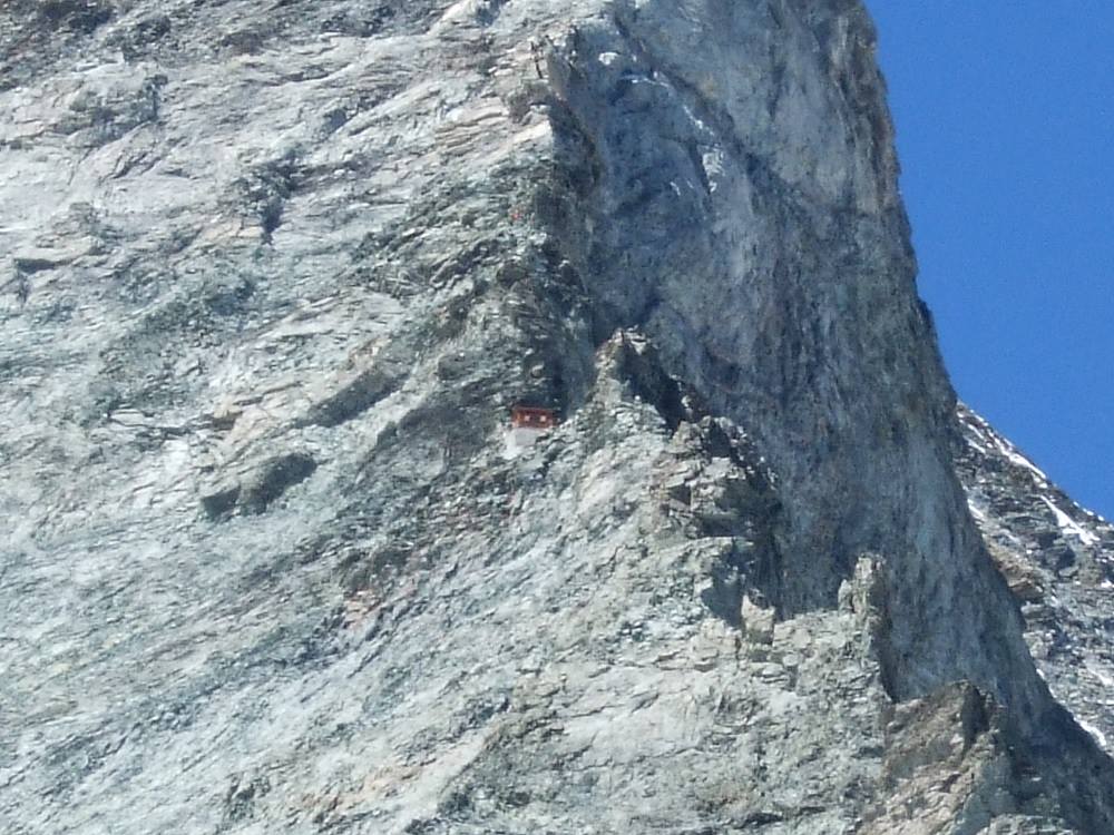 ソルベイ小屋は、同じ尾根ルートで達成したマッターホルンの初登頂から50年後の1917年に建設されたんやで。現在では10人分の収容スペースと無線電話が設置されているんや。小屋の名は、出資者でありベルギーの化学者で実業家のエルネスト・ソルベーにちなむ[2]んや。