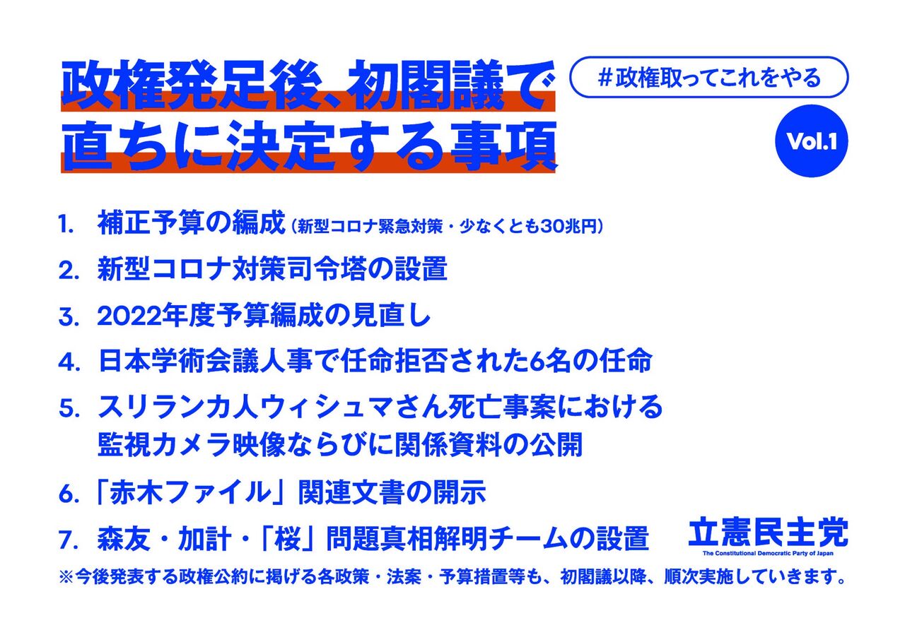 立憲民主党の枝野幸男代表は7日、次期衆院選で政権交代を実現した場合に発足する「枝野内閣」が、初閣議で決定する政策を発表した。