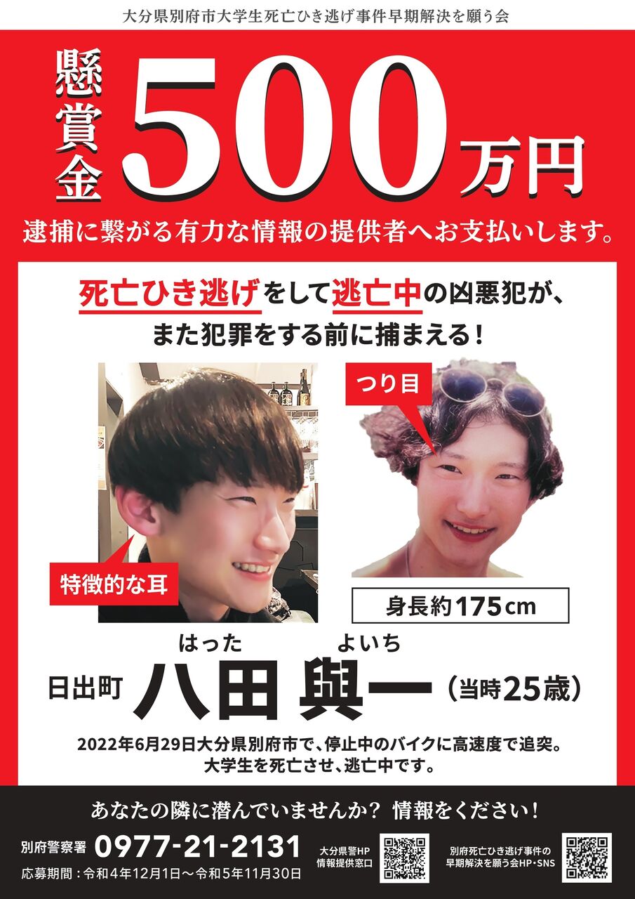 - 死亡ひき逃げ犯の八田與一容疑者を重要指名手配犯に指定 懸賞金は800万円に