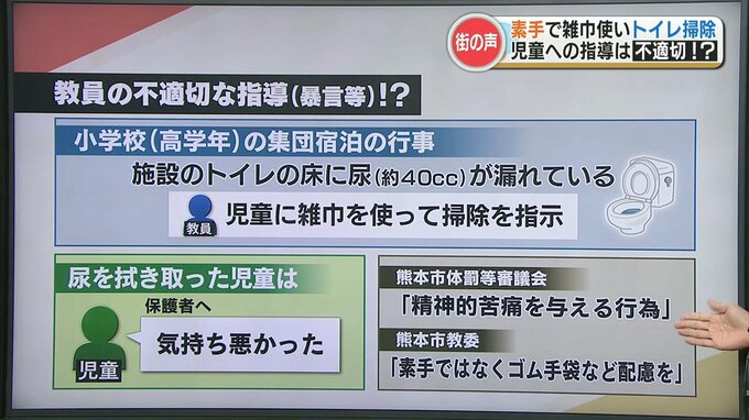 便器の周りの尿を雑巾を使って素手で拭き取らせたという。
