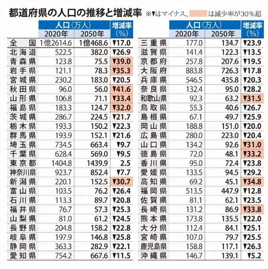 2050年の人口、11県で3割減予測 25道県で高齢者4割に