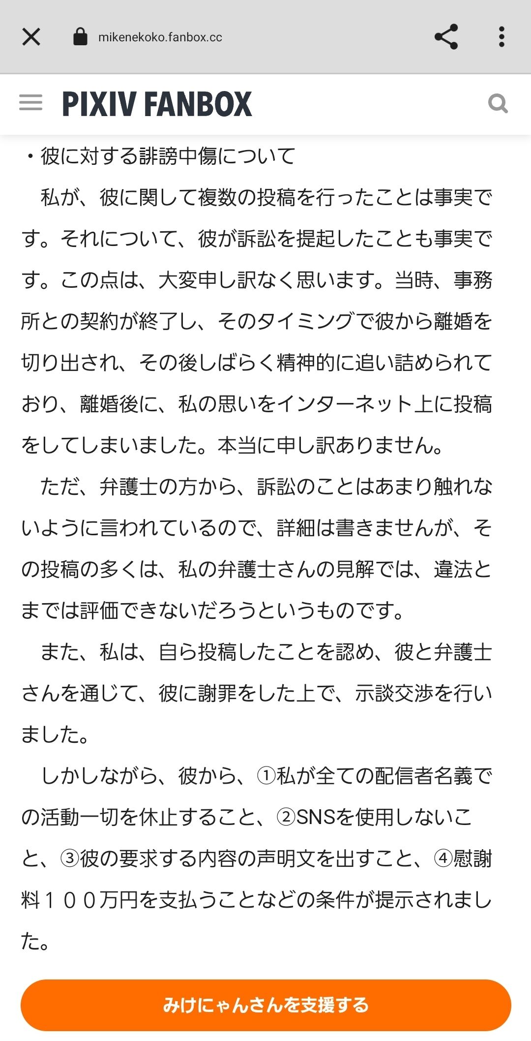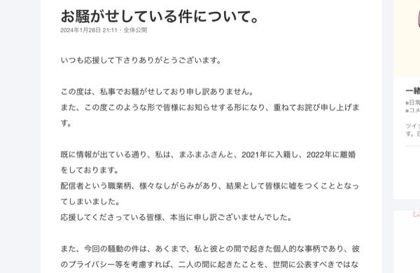 当時、事務所との契約が終了し、そのタイミングで彼から離婚を切り出され、その後しばらく精神的に追い詰められており、離婚後に、私の思いをインターネット上に投稿をしてしまいました。本当に申し訳ありません。