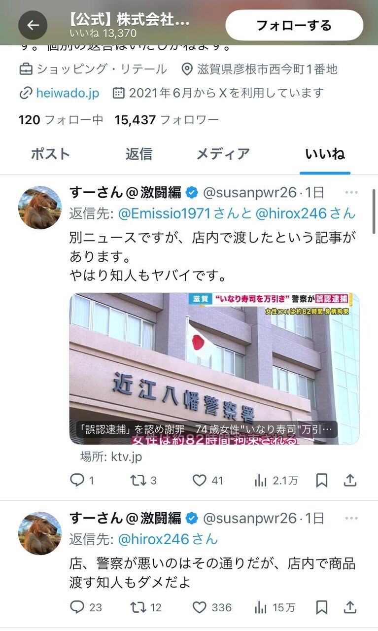 この同じ一般ユーザーの投稿2件に平和堂の公式Xアカウントが「いいね」を付けていた。