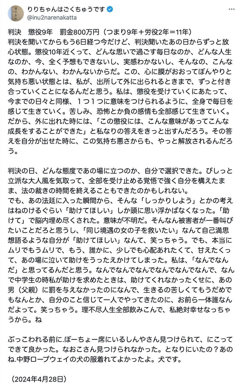 面白いから控訴審で刑期を増し増しにしてリリちゃんの反応を見たい