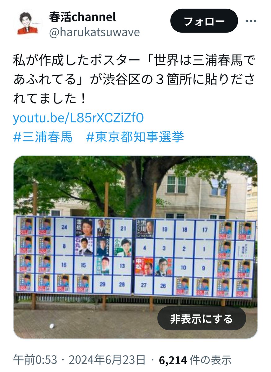 アミューズ法務部の公式Xアカウントはこの日、「東京都知事選挙の掲示板に当社所属アーティストである三浦春馬の氏名と肖像(似顔絵)が使用された選挙ポスターが掲示されていますが、そのような利用については一切許諾しておらず、当社は東京都選挙管理委員会に対し抗議しております」と報告していた。