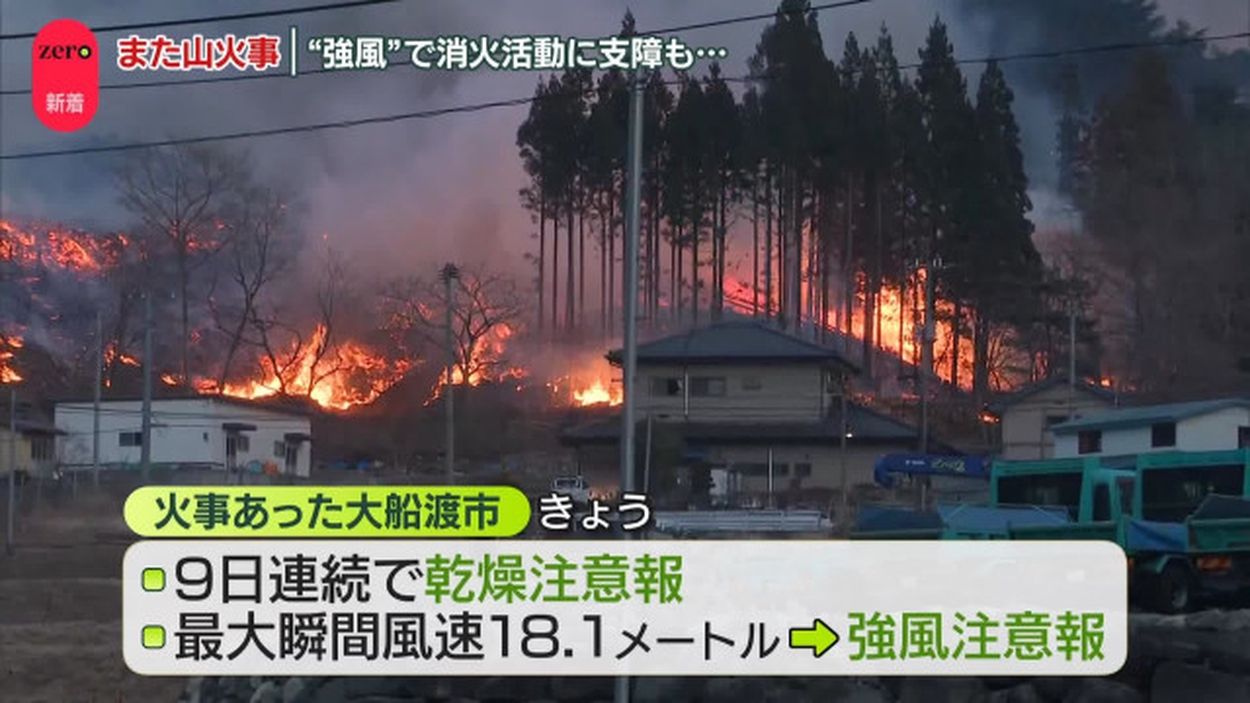 26日は地上から消防などが消火にあたったが、強風のため防災ヘリなどによる散水作業はできなかった。同市三陸町綾里りょうり地区では午後5時頃、至るところに白煙が立ちこめ、火柱を上げる家屋や、焼け焦げた骨組みが残った家屋が見られた。現場周辺は東日本大震災の津波被害を受けた地域で、震災後に建て替えた建物も焼けた可能性があるという。