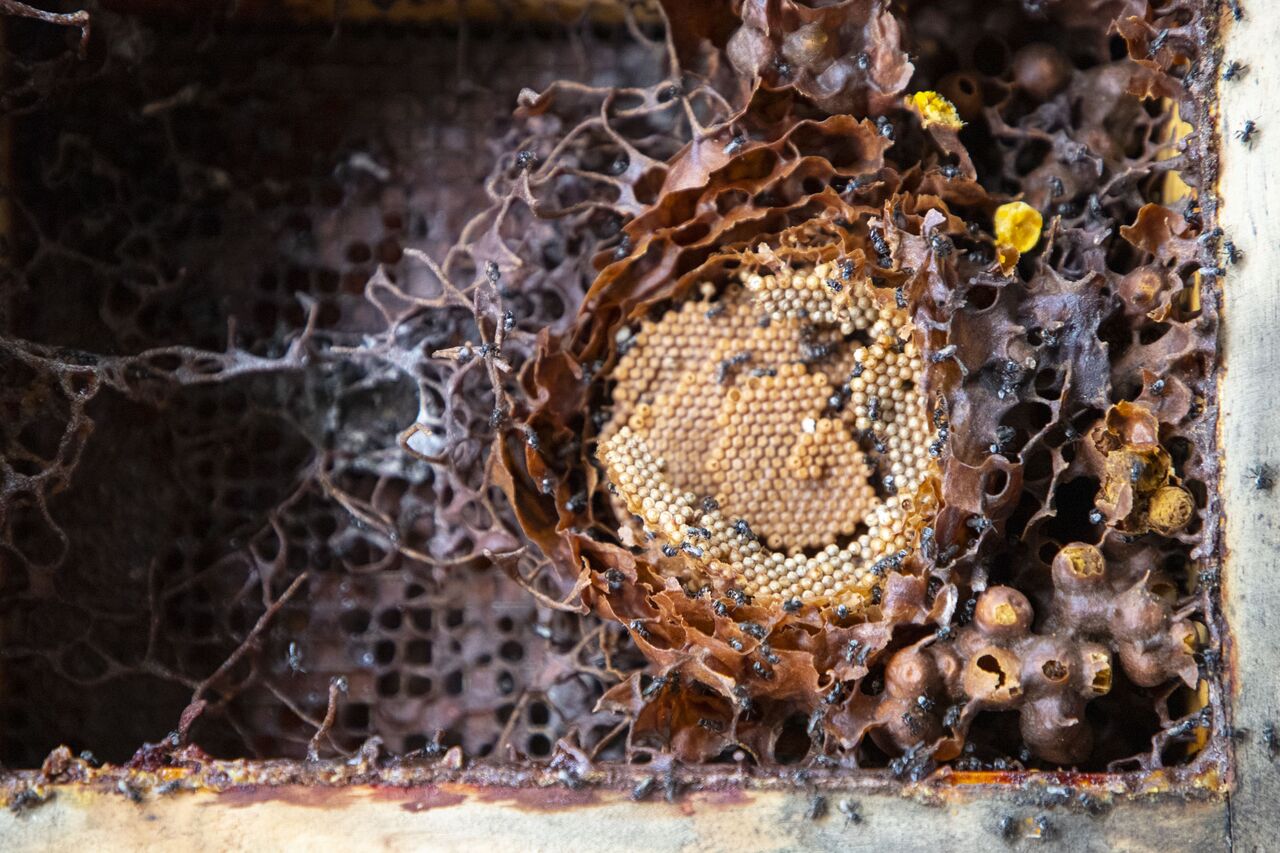 - ミツバチさん、仁王像の頭の中に巣を作る