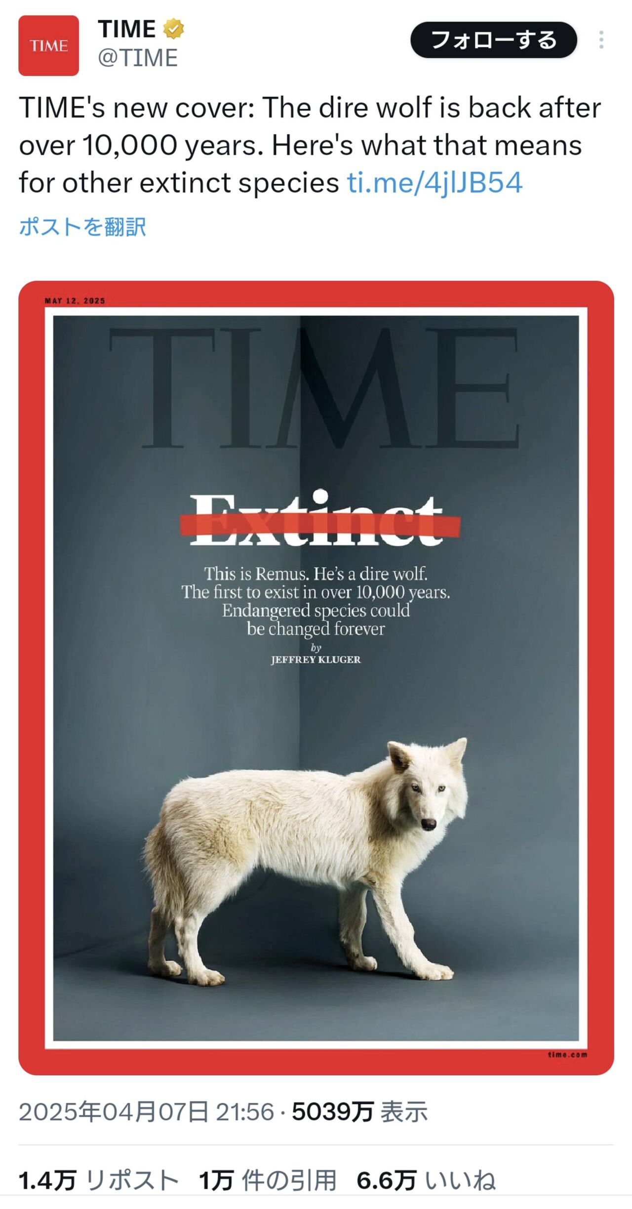 アメリカ・テキサス州に本社を置くバイオテクノロジー企業のコロッサル・バイオサイエンス社が4月7日、約1万2000年前に絶滅したとされるオオカミ、ダイアウルフの子どもを誕生させることに成功したと発表した