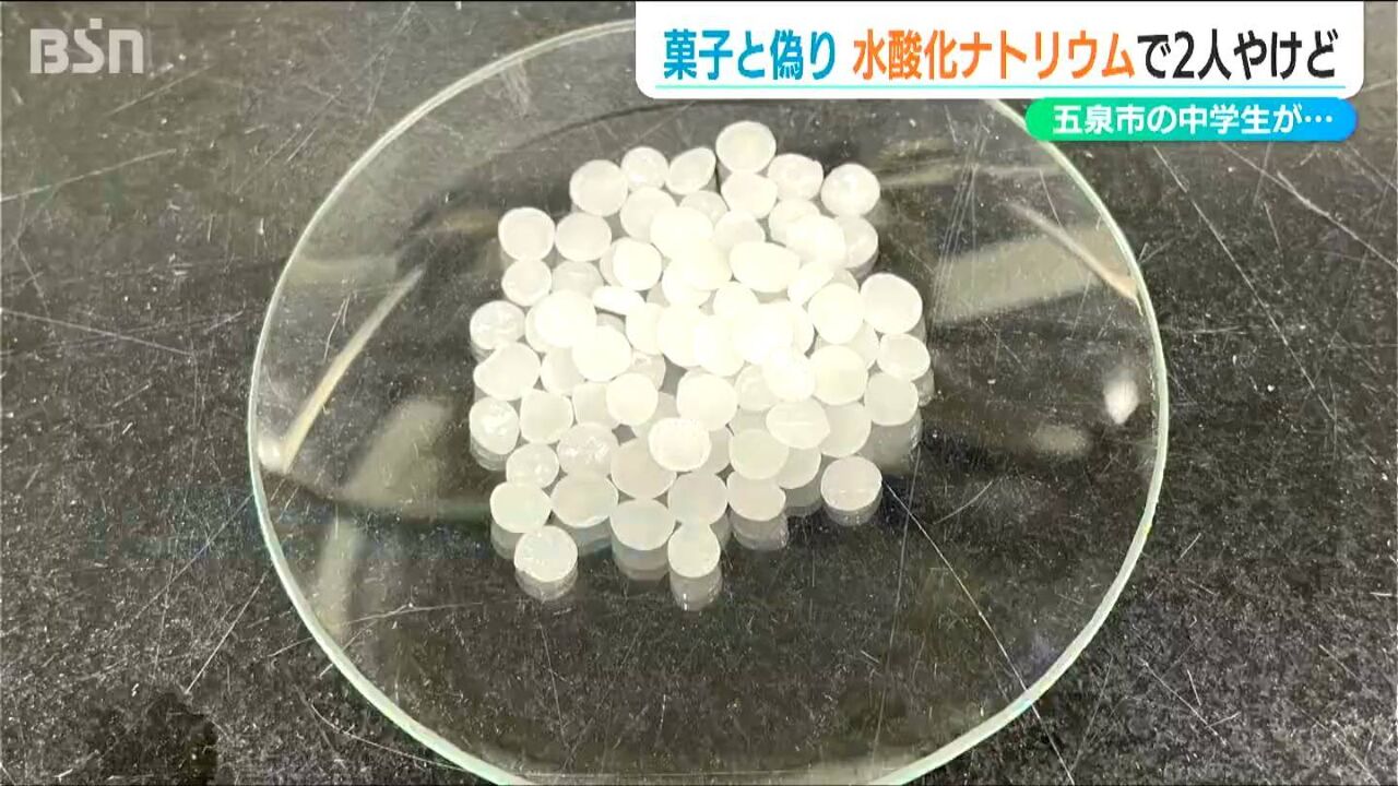 実験では水酸化ナトリウムが使われましたが、1人の男子生徒がそれを隠して持ち出し、お菓子だと偽って下級生2人に食べさせようとしたということです。