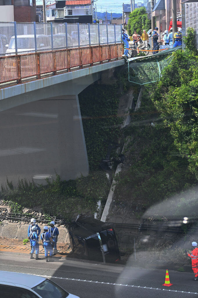 6月1日午後1時半頃、浜松市中央区初生町で車が東名高速をまたぐ橋の脇から東名・上り線の路側帯へと転落する事故がありました。