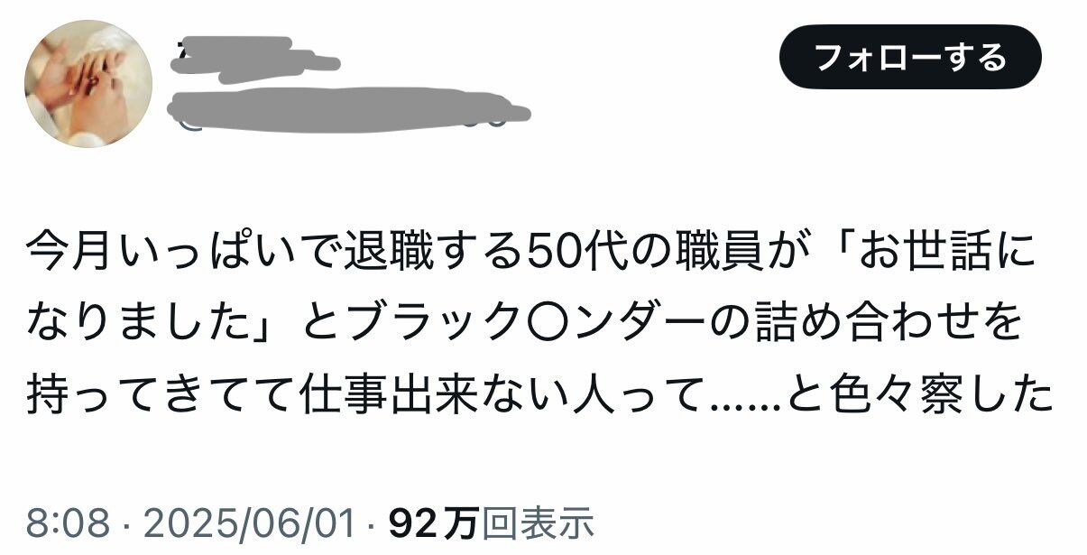 退職後に付き合い無くなるような会社ならしょうもない菓子なんて配らんでええのにな