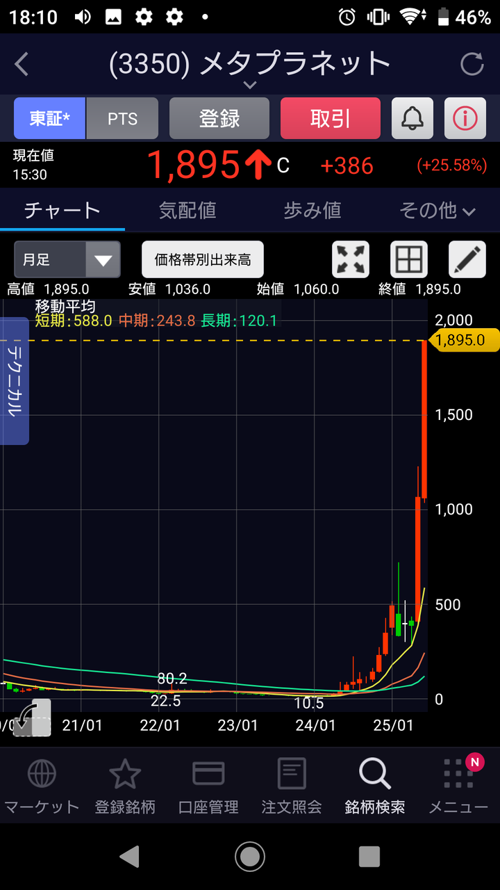 16日の東京株式市場でメタプラの株価は前週末比26%高の1895円と、約12年ぶりの高値を付けた。時価総額は前週末の9065億円から1兆1384億円に拡大、半導体メーカーのキオクシアホールディングスや東京地下鉄(東京メトロ)といった大企業を上回った。