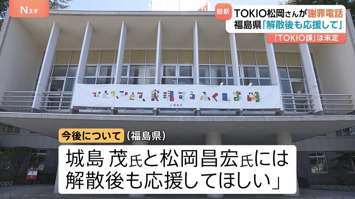 2021年に「TOKIO課」を設置した福島県庁企画調整部は25日、TOKIOの解散を受け、今後は城島茂、松岡昌宏と新たな関係を築いていくと発表した。