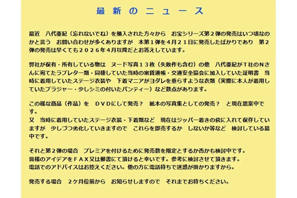 《弊社が保有・所有している物は ヌード写真13枚(失敗作も含む)の他 八代亜紀がT社のNさんに宛てたラブレター類・同棲していた当時の家賃通帳・交通安全協会に加入していた証明書 当時に着用していたステージ衣装や 下着マニアがヨダレを垂らすような衣類(実際に本人が着用していたブラジャー・少しシミの付いたパンティー)など数点があります》