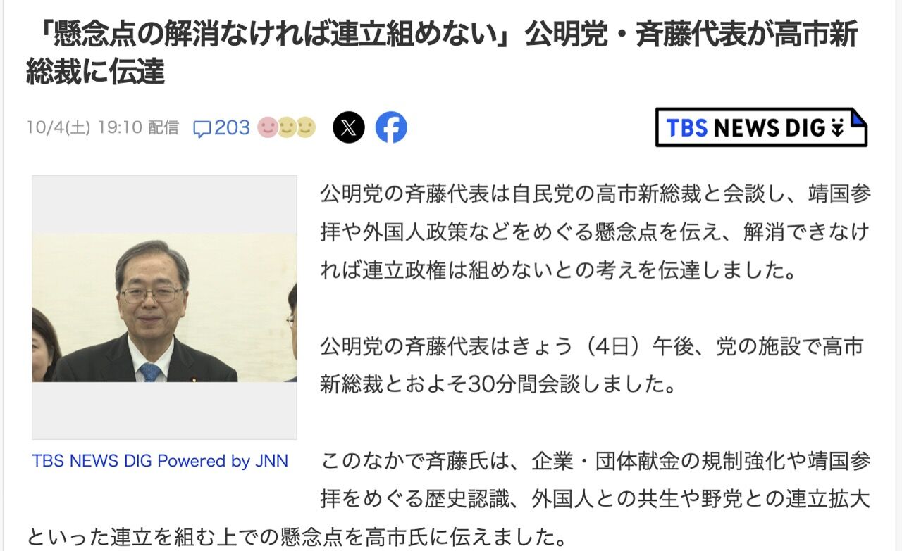 高市は前回の総裁選の最後の演説で「公明党ありがとー」をタイムオーバーしながらしてドン引きされるくらい公明党とべったりやぞ