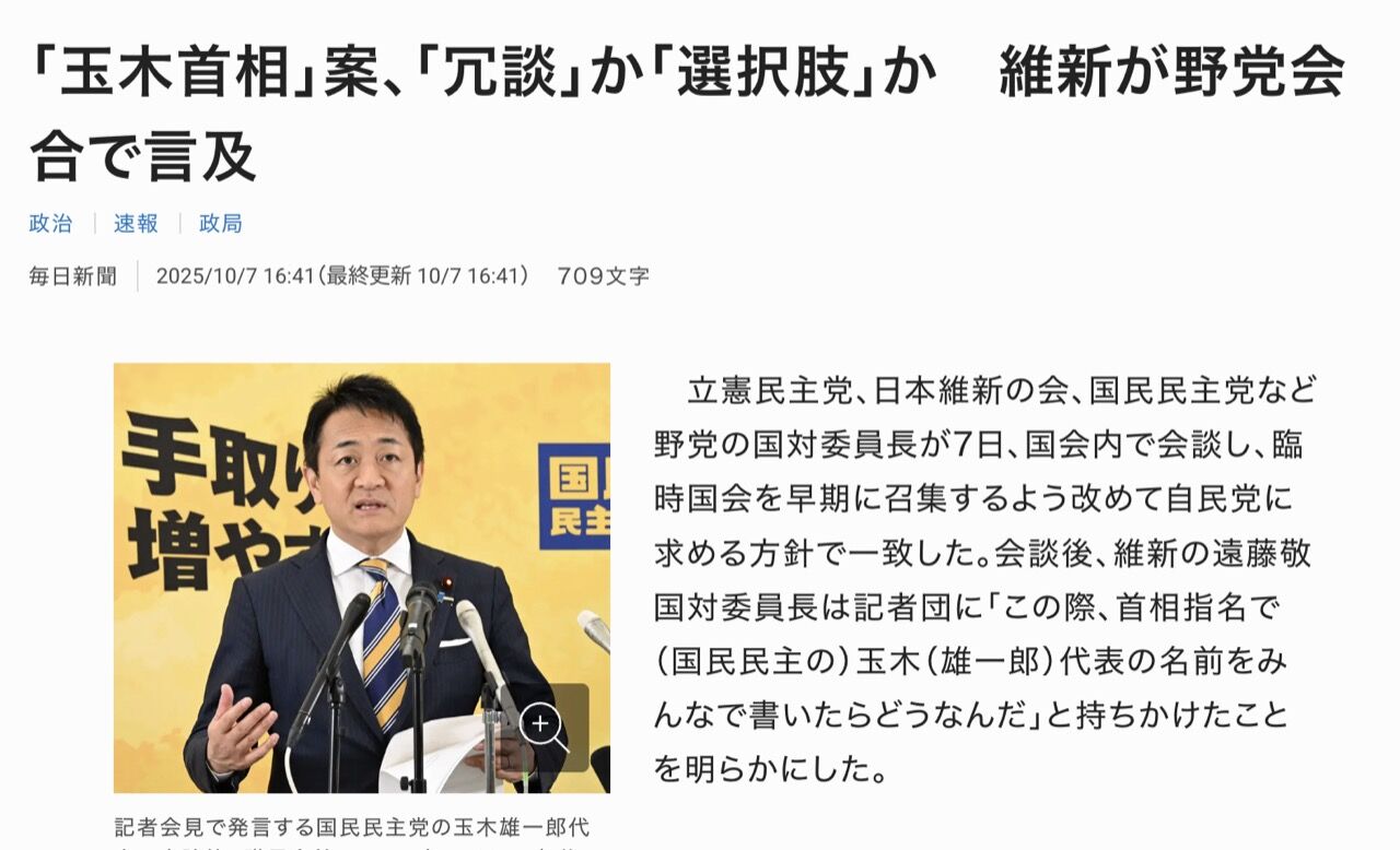 会談後、維新の遠藤敬国対委員長は記者団に「この際、首相指名で(国民民主の)玉木(雄一郎)代表の名前をみんなで書いたらどうなんだ」と持ちかけたことを明らかにした。