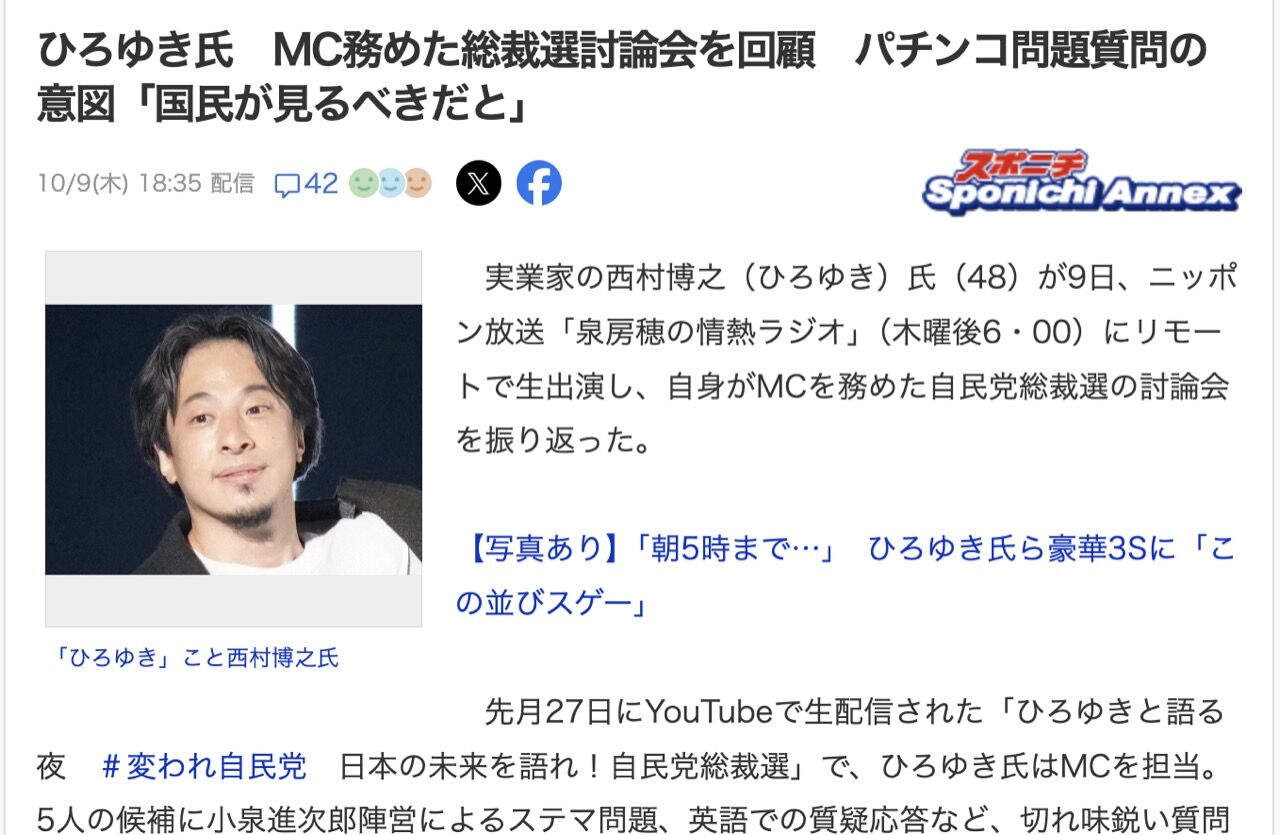 実業家の西村博之(ひろゆき)氏(48)が9日、ニッポン放送「泉房穂の情熱ラジオ」(木曜後6・00)にリモートで生出演し、自身がMCを務めた自民党総裁選の討論会を振り返った。