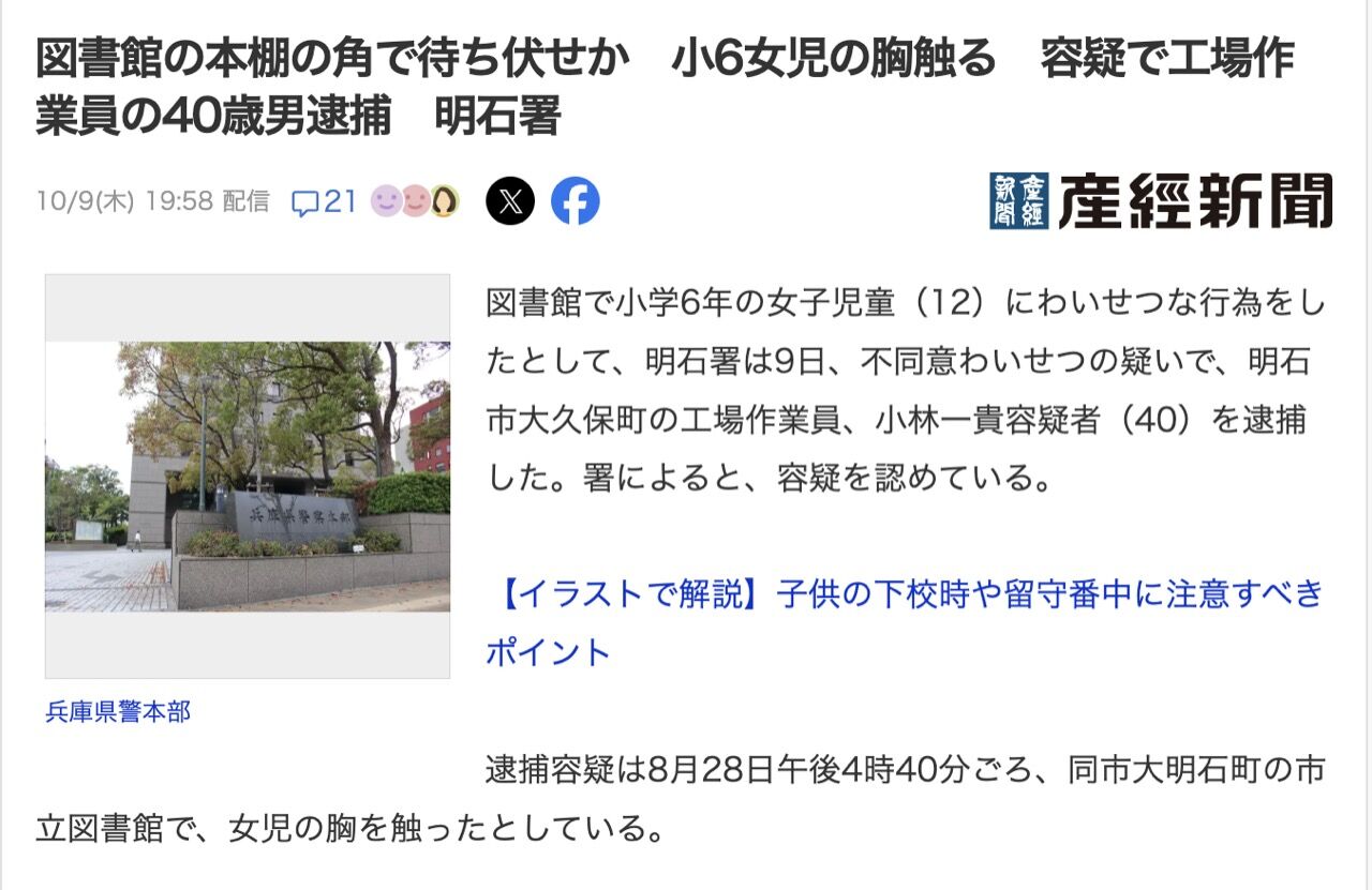 図書館の本棚の角で待ち伏せか 小6女児の胸触る 容疑で工場作業員の40歳男逮捕 明石署