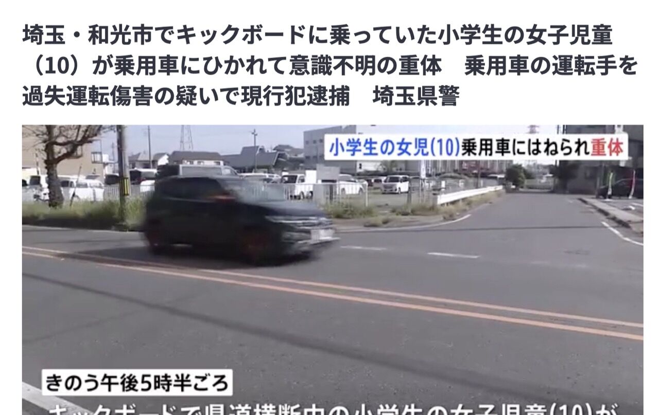 埼玉・和光市でキックボードに乗っていた小学生の女子児童(10)が乗用車にひかれて意識不明の重体 乗用車の運転手を過失運転傷害の疑いで現行犯逮捕