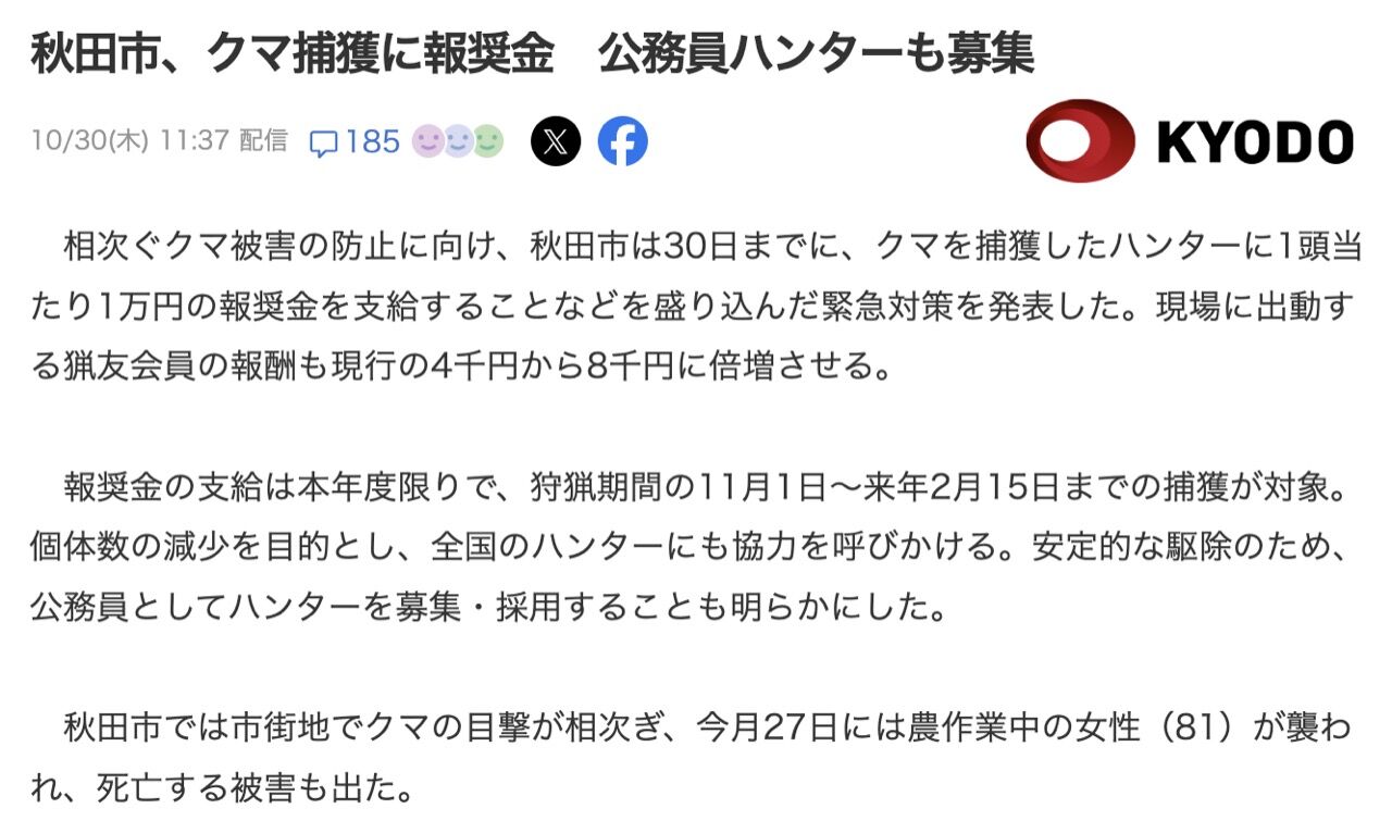 秋田は年間2000頭以上狩ったこともあるし人が増えてないわけじゃないよ