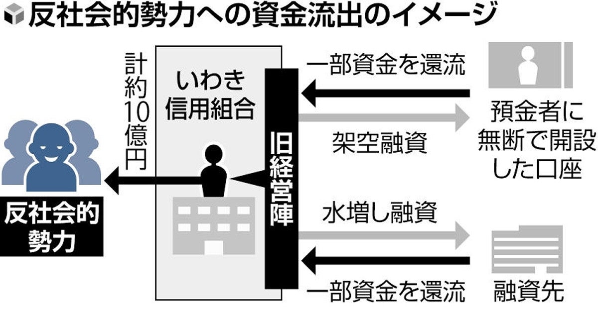 不正融資を繰り返して多額の資金流用をしていたいわき信用組合(福島県いわき市)が、反社会的勢力に約10億円の資金を提供していたことが10月31日、新たにわかった。同信組は旧経営陣の責任を追及し、再生する決意を示したが、長年にわたる反社勢力との癒着が浮き彫りになり、組合員らからは失望の声が聞かれた。