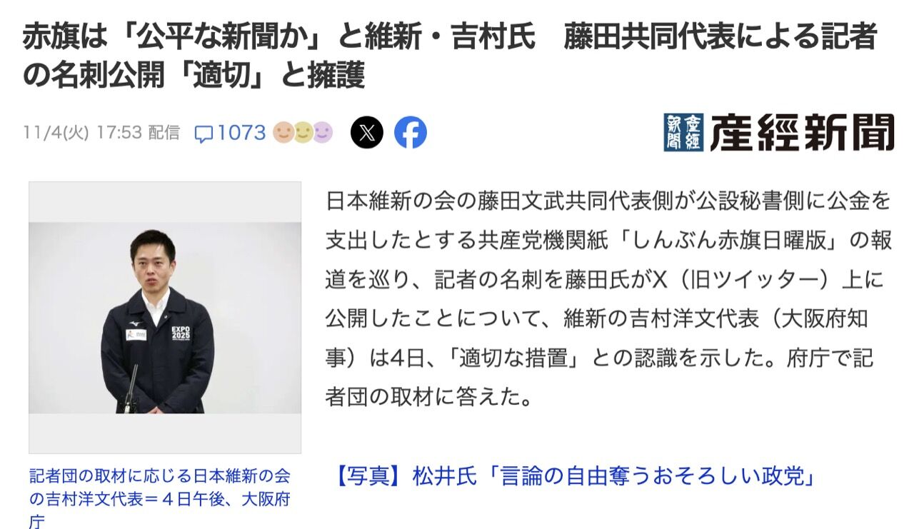 日本維新の会の藤田文武共同代表側が公設秘書側に公金を支出したとする共産党機関紙「しんぶん赤旗日曜版」の報道を巡り、記者の名刺を藤田氏がX(旧ツイッター)上に公開したことについて、維新の吉村洋文代表(大阪府知事)は4日、「適切な措置」との認識を示した。府庁で記者団の取材に答えた。