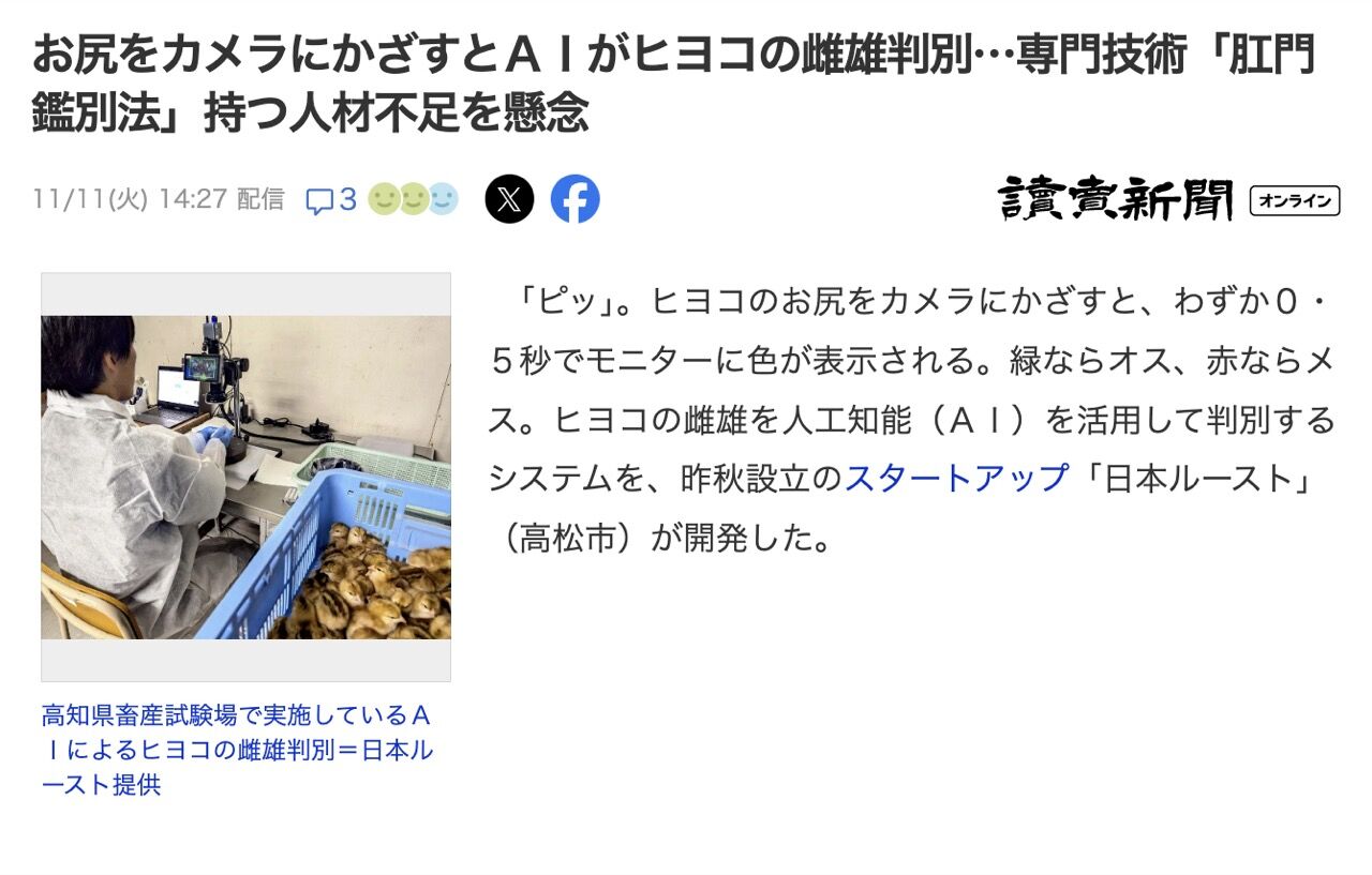 「ピッ」。ヒヨコのお尻をカメラにかざすと、わずか0・5秒でモニターに色が表示される。緑ならオス、赤ならメス。ヒヨコの雌雄を人工知能(AI)を活用して判別するシステムを、昨秋設立のスタートアップ「日本ルースト」(高松市)が開発した。