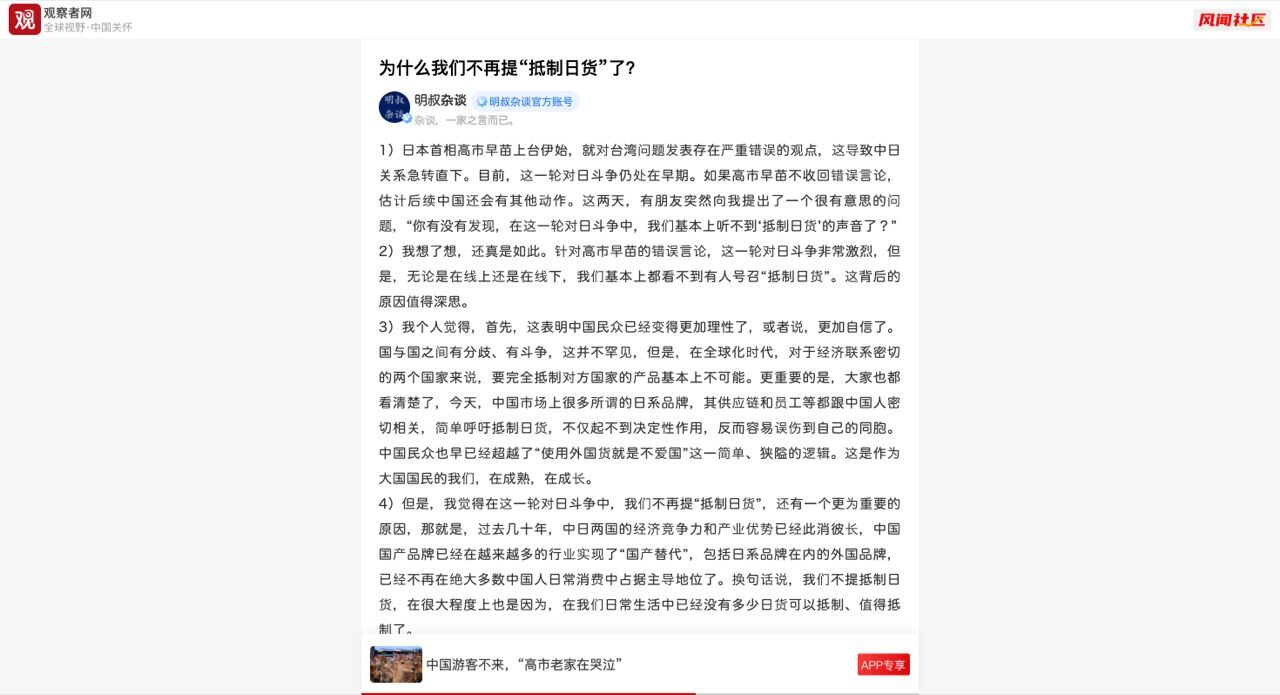 4) しかし、今回の対日闘争において「日本製品の不買」という言葉を口にしなくなったのには、さらに重要な理由があると考えています。過去数十年にわたり、中国と日本の経済競争力と産業上の優位性は劇的に変化しました。中国国内ブランドはますます多くの産業で「国内代替」を実現し、日本ブランドを含む外国ブランドはもはや大多数の中国人の日常消費を支配していません。言い換えれば、私たちが日本製品の不買を行わないという決断を下したのは、私たちの日常生活において、不買に値する日本製品がほとんど残っていないことが大きな理由です。