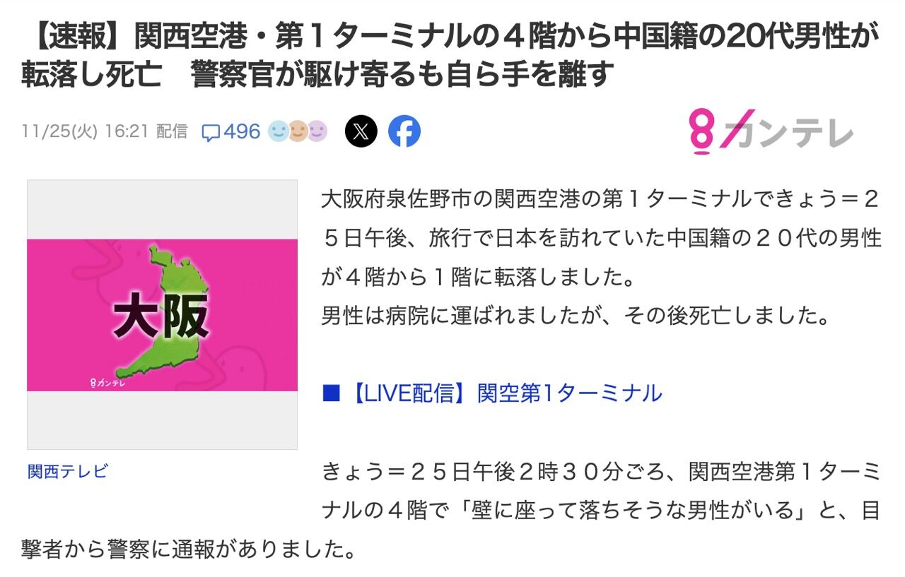 きょう=25日午後2時30分ごろ、関西空港第1ターミナルの4階で「壁に座って落ちそうな男性がいる」と、目撃者から警察に通報がありました。
