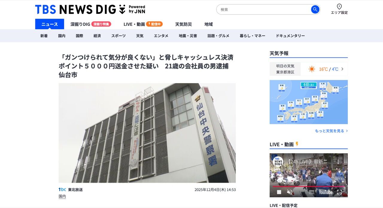 「ガンつけられて気分が良くない」と脅しキャッシュレス決済ポイント5000円送金させた疑い 21歳の会社員の男逮捕 仙台市 | TBS NEWS DIG (1ページ)