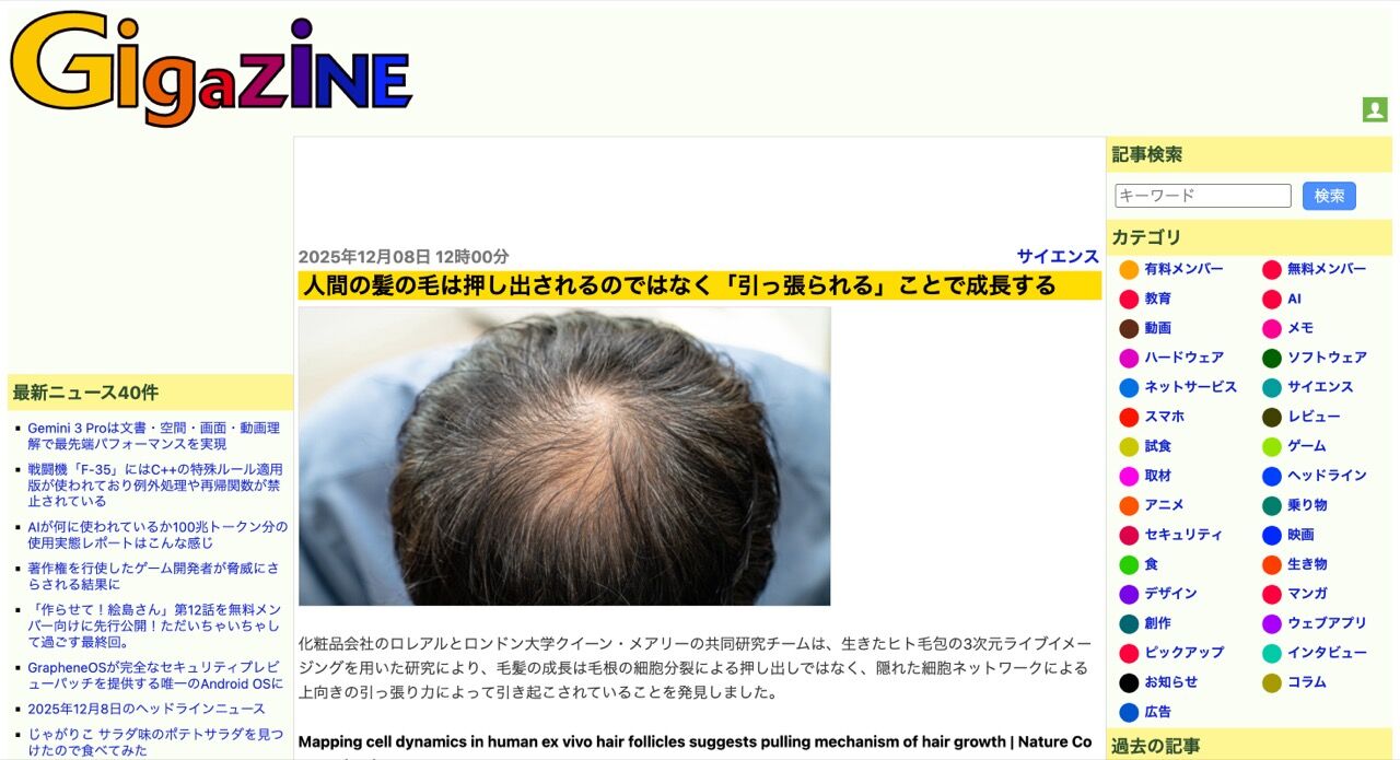 化粧品会社のロレアルとロンドン大学クイーン・メアリーの共同研究チームは、生きたヒト毛包の3次元ライブイメージングを用いた研究により、毛髪の成長は毛根の細胞分裂による押し出しではなく、隠れた細胞ネットワークによる上向きの引っ張り力によって引き起こされていることを発見しました。