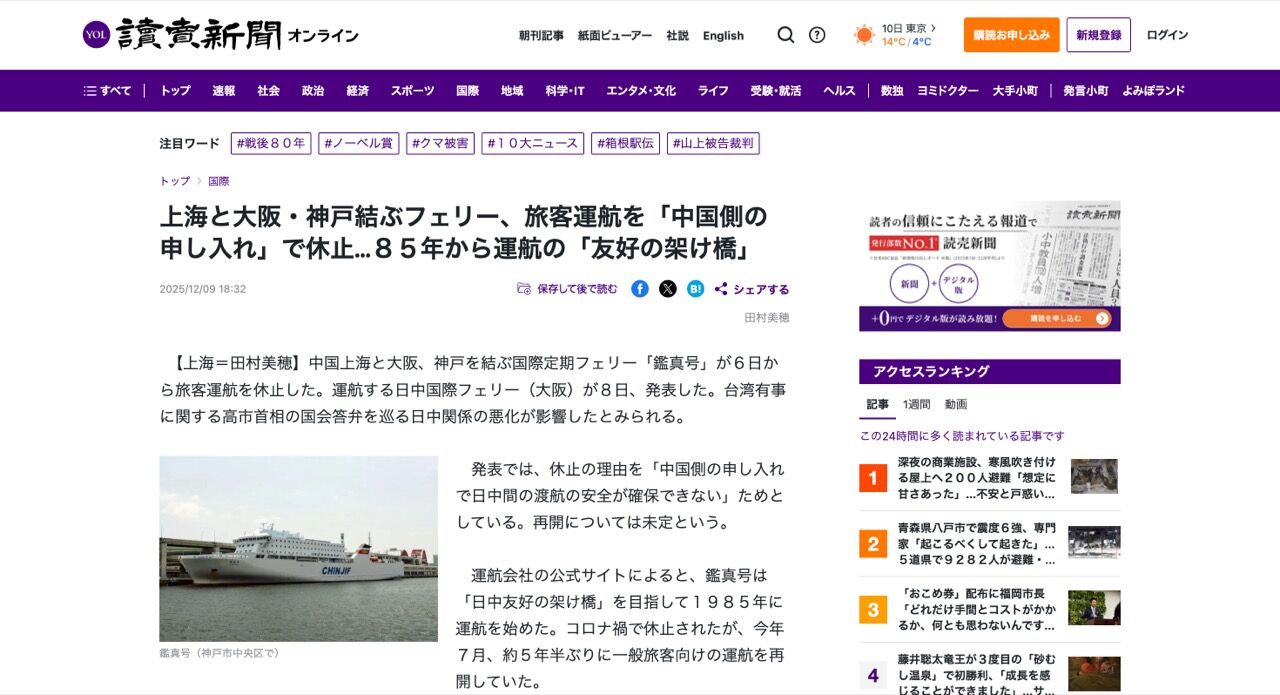 上海と大阪・神戸結ぶフェリー、旅客運航を「中国側の申し入れ」で休止…85年から運航の「友好の架け橋」 : 読売新聞