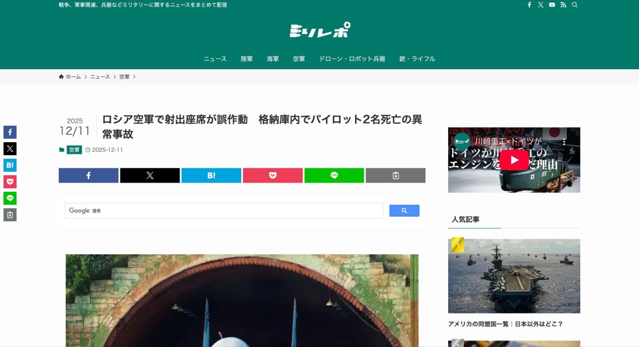 ロシア国内の空軍基地で、極めて異例かつ深刻な航空事故が発生しました。駐機中の軍用機内で射出座席が突発的に作動し、搭乗していた乗員2名が死亡したと、複数の海外情報筋が報じています。この事故は、ロシア航空宇宙軍における安全管理体制の脆弱性を改めて浮き彫りにするものであり、大きな波紋を広げています。