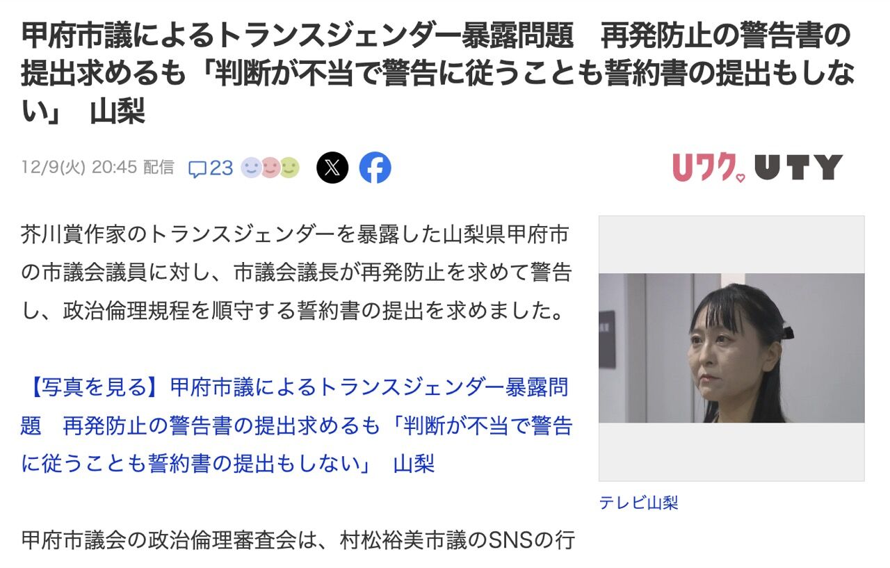 >甲府市議の村松裕美氏は24年5月、フェイスブックで「身体が男性で手術もしていません」などと投稿。未成年時の写真や過去の氏名なども投稿したという。