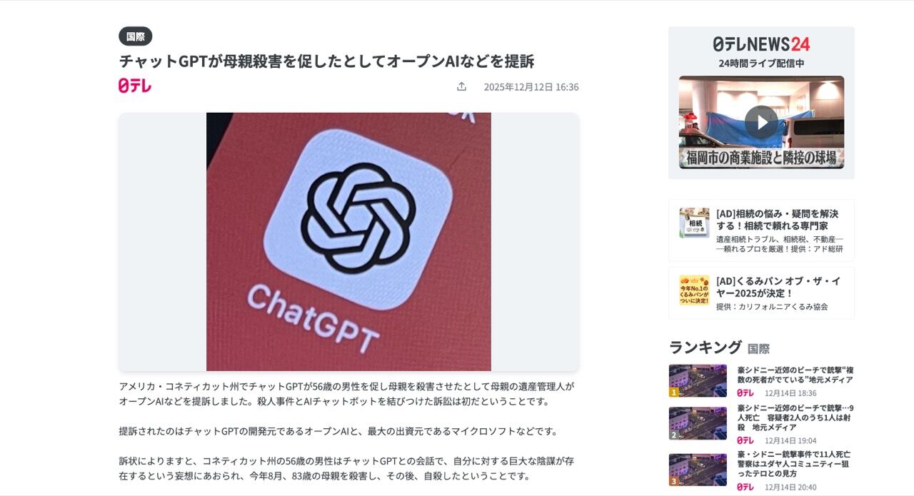チャットGPTが母親殺害を促したとしてオープンAIなどを提訴(2025年12月12日掲載)|日テレNEWS NNN