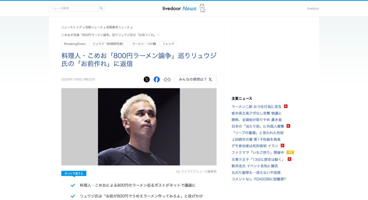 格闘技イベントBreakingDown(ブレイキングダウン)に参戦経験のある「世界で闘う料理人。」こめおが9日、自身のX(旧ツイッター)を更新。料理研究家リュウジ氏からの「お前が800円でうめえラーメン作ってみろよ」投稿に対し返信し、議論が白熱している。