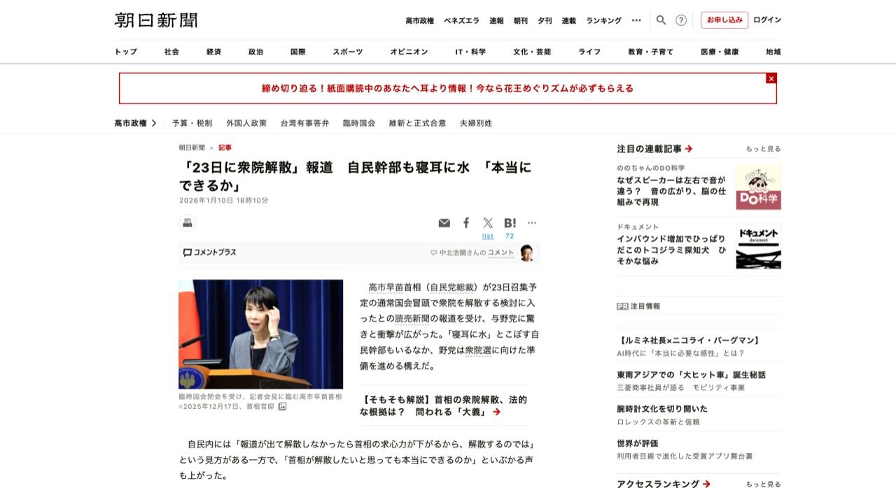 高市早苗首相(自民党総裁)が23日召集予定の通常国会冒頭で衆院を解散する検討に入ったとの読売新聞の報道を受け、与野党に驚きと衝撃が広がった。「寝耳に水」とこぼす自民幹部もいるなか、野党は衆院選に向けた準備を進める構えだ。