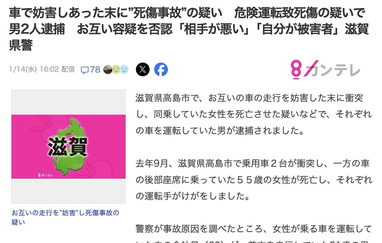 車で妨害しあった末に”死傷事故”の疑い 危険運転致死傷の疑いで男2人逮捕 お互い容疑を否認「相手が悪い」「自分が被害者」滋賀県警