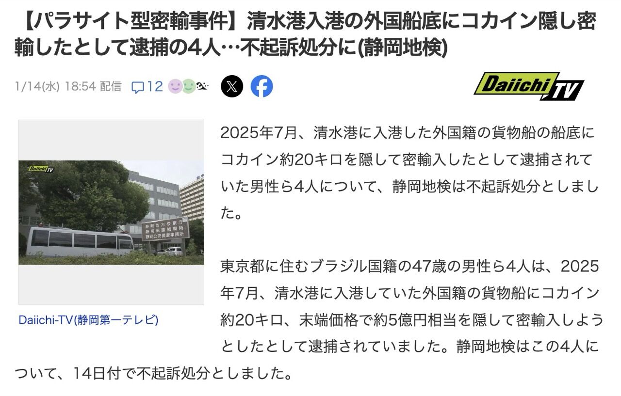 - 【静岡地検】スペインから末端価格1000万円以上の覚醒剤などを密輸した夫婦、不起訴処分に