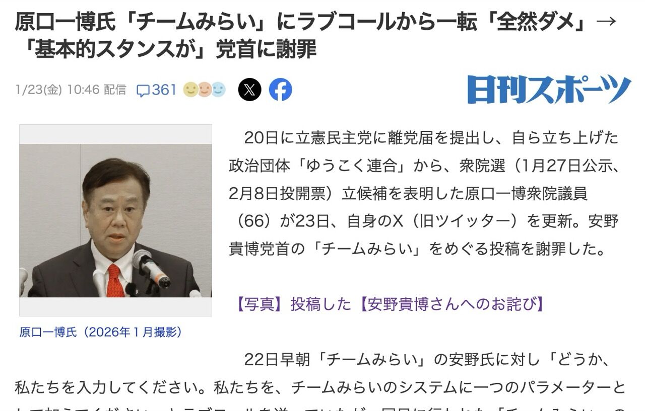 20日に立憲民主党に離党届を提出し、自ら立ち上げた政治団体「ゆうこく連合」から、衆院選(1月27日公示、2月8日投開票)立候補を表明した原口一博衆院議員(66)が23日、自身のX(旧ツイッター)を更新。安野貴博党首の「チームみらい」をめぐる投稿を謝罪した。