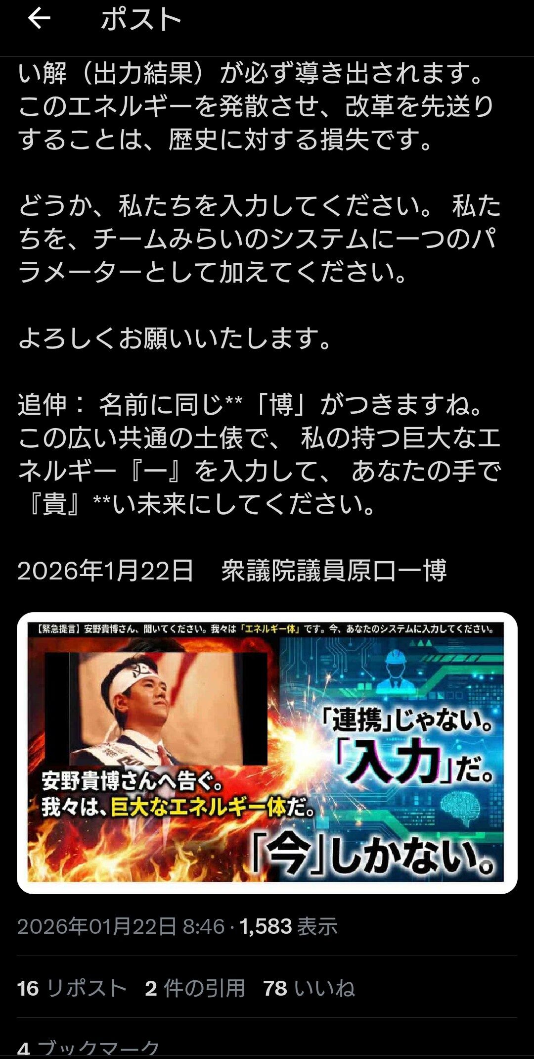 22日早朝「チームみらい」の安野氏に対し「どうか、私たちを入力してください。私たちを、チームみらいのシステムに一つのパラメーターとして加えてください」とラブコールを送っていたが、同日に行われた「チームみらい」の会見内での言及はなく、安野氏のXでも反応がなかった。